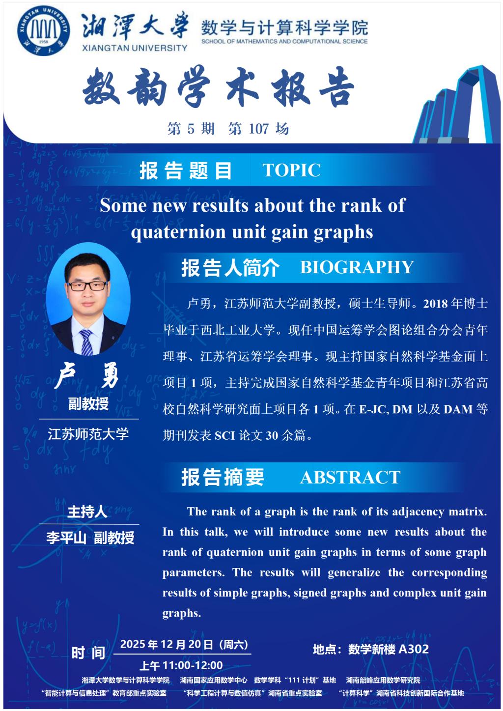数韵学术报告-卢勇-Some new results about the rank of quaternion unit gain graphs