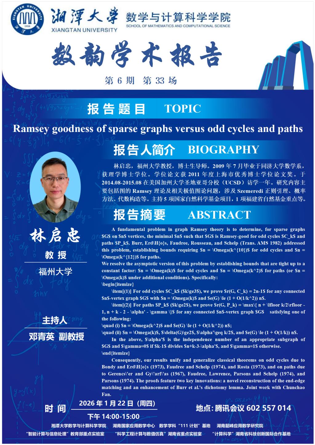 数韵学术报告-林启忠-Ramsey goodness of sparse graphs versus odd cycles and paths