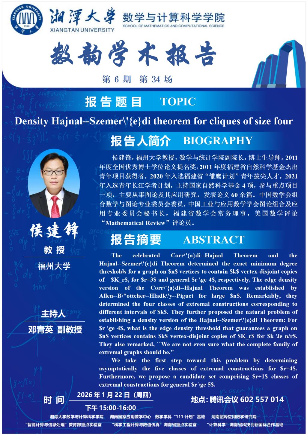 数韵学术报告-侯建锋-Density Hajnal--Szemer\'{e}di theorem for cliques of size four