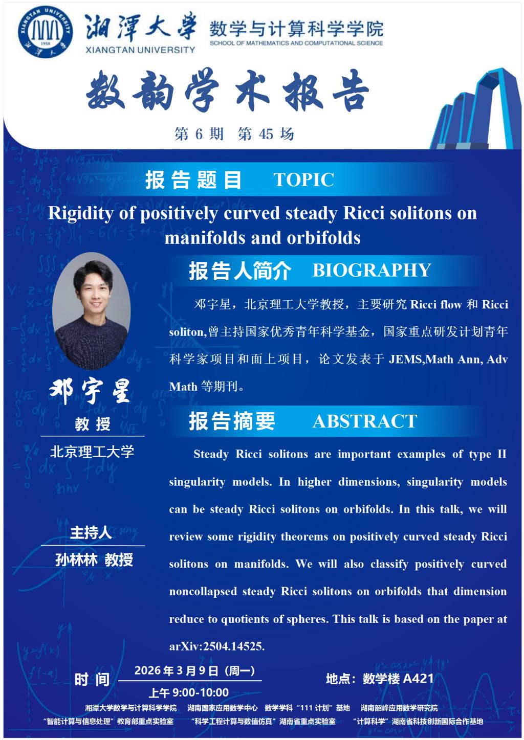 数韵学术报告—邓宇星—Rigidity of positively curved steady Ricci solitons on manifolds and orbifolds