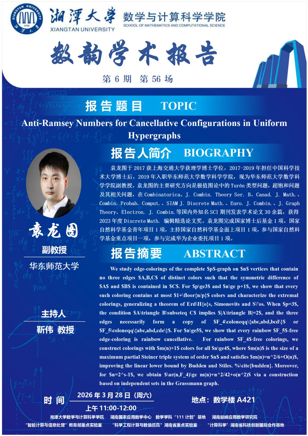 数韵学术报告—袁龙图—Anti-Ramsey Numbers for Cancellative Configurations in Uniform Hypergraphs