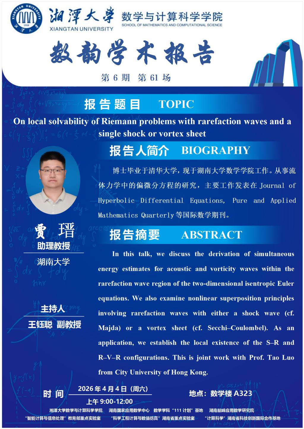 数韵学术报告—贾瑨—On local solvability of Riemann problems with rarefaction waves and a single shock or vortex sheet