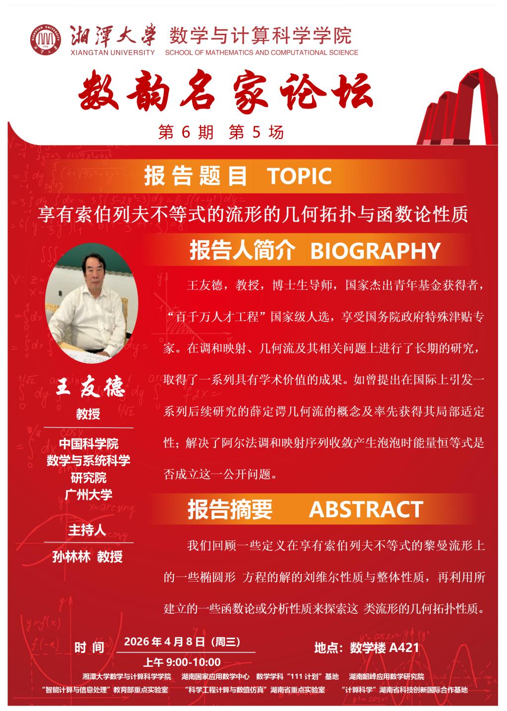 数韵名家论坛—王友德—享有索伯列夫不等式的流形的几何拓扑与函数论性质