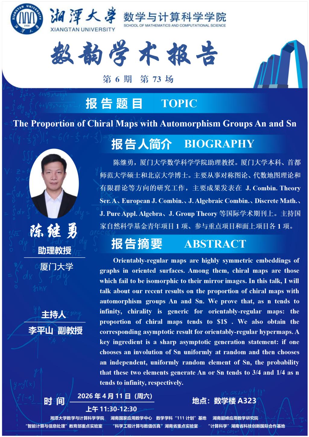 数韵学术报告—陈继勇—The Proportion of Chiral Maps with Automorphism Groups An and Sn